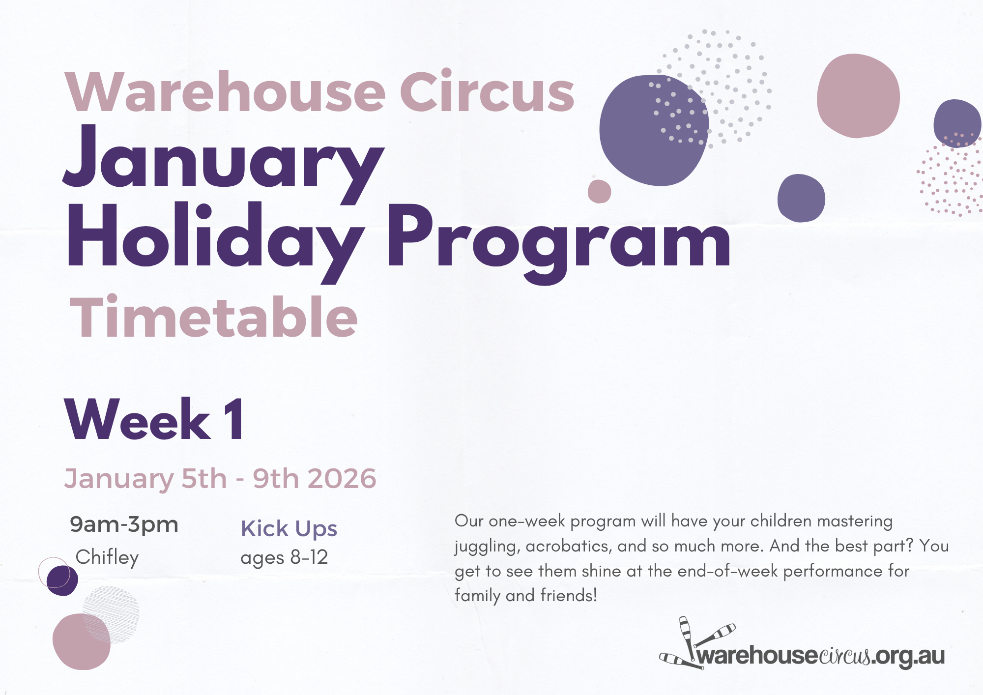 - 9am – 12pm Chifley 12th-16th January 2026