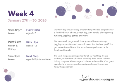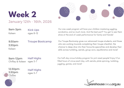 This week-long program is perfect for all our Next Step Troupe students, and students who have previously done lots of Kick Ups holiday programs. With a range of different skills on offer, it’s a great opportunity to improve your knowledge and spend time on your favourite specialities!