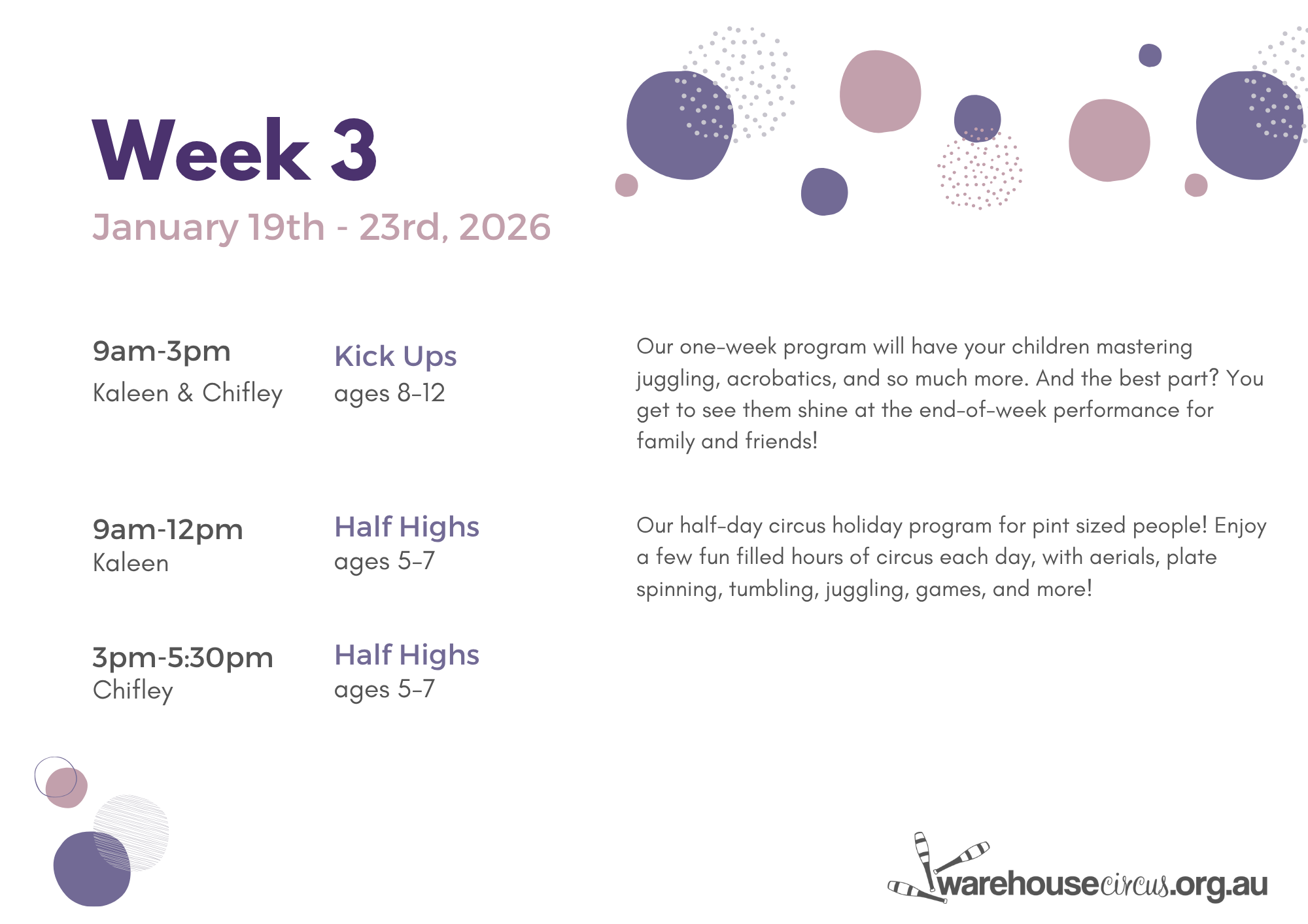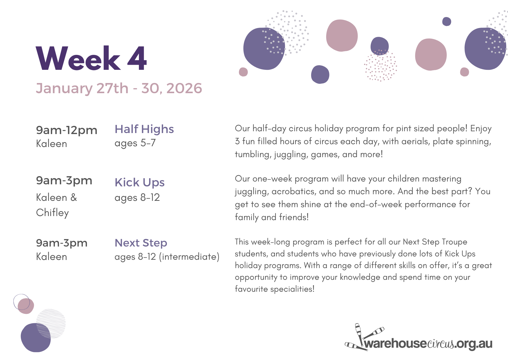 5-7 Year Olds- 9am – 12pm Kaleen 12th-16th, 19th-23rd and 27th-30th January 2026